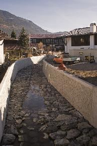 Chociaż nowe koryto rzeki wygląda pięknie, to jednak niewielu obserwatorów się domyśla, jak skomplikowane było jego zbudowanie. Z 40 elementów konstrukcyjnych każdy był inny i szalunek musiał być w każdym miejscu rozwiązywany indywidualnie. Jednym z powodów było to, że ściany betonowe koryta rzeki są zagięte w dwóch płaszczyznach: po pierwsze ? po to, aby śledzić bieg rzeki, która wije się przez miejscowość, i po drugie ? aby naśladować przekrój rynny w kształcie litery U. Do tego doszło utrudnienie w postaci naturalnego pagórkowatego ukształtowania terenu i pochylenia koryta rzeki: ściany rynny rzecznej zbudowano przy pomocy matryc strukturalnych, górne krawędzie ścian tworzą zaś tzw. murowaną koronę o wysokości 40 cm. Ta przystosowuje się do przebiegu terenu, podczas gdy druga strona muru dostosowuje się w swej wysokości do kąta nachylenia rzeki. Na skutek tego ściany boczne koryta rzeki wykazywały w każdym miejscu inną wysokość. Aby uzyskać przyjemne wrażenie ostateczne, pracownicy firmy wykonawczej, Teerag-Asdag Aktiengesellschaft, pod kierownictwem regionu Roppen, Austria, zadbali najpierw o to, aby matryca strukturalna NOEplast zwięźle łączyła się z dolną krawędzią cokołu. Musieli przy tym cały czas bardzo uważać na to, aby poszczególne rzędy muru były równomiernie kontynuowane. Mimo to udawało się im używać matryc szalunkowych do 60 razy. Na skutek różnej wysokości ścian zdarzało się od czasu do czasu, że matryca była u dołu o kilka centymetrów za krótka i beton był w tym miejscu gładki. Tego jednak właściwie nie widać, ponieważ w korycie rzeki układano bloki z naturalnego kamienia, które i tak przykrywają tę część ściany.