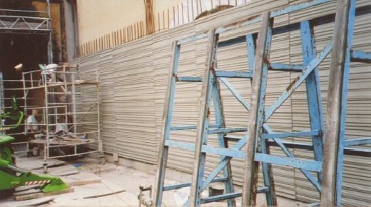 Angermuseum w Erfurcie wyróżnia się dziedzińcem wewnętrznym, wokół którego tworzą się bryły budynku pełniące kiedyś różne funkcje. Południowe, otwarte w kierunku dziedzińca wewnętrznego skrzydło kompleksu stanowiło niegdyś schronienie dla koni. W trakcie przebudowy w 1999 roku zostało ono zamknięte ścianą żelbetonową. W ścianę wbudowano trzy duże okna łukowe. Dzisiaj w pomieszczeniach tych przechowywane są grafiki, rysunki oraz druki artystyczne, które w miarę możliwości powinny być chronione przed dostępem światła. Z tego względu konieczna była zmiana struktury otworów. Po kilku eksperymentach z różnymi materiałami budowlanymi planiści zdecydowali się na strukturalny beton licowy, którego powierzchnia powinna przypominać o nawarstwionych paspartach, względnie ramach obrazów. Na początku pracownicy biura Worschech planowali wykonanie ściany o wysokości 33 m i 12 m na miejscu. Jednak trudne warunki przyczyniły się do tego, że planiści wraz z realizującym prace przedsiębiorstwem budowlanym Ebert Bau Berga GmbH & Co musieli szukać alternatywnego rozwiązania. Zdecydowano się na niekonwencjonalną, wielowarstwową konstrukcję ściany składającą się z jednej dodatkowej warstwy izolacyjnej, warstwy betonowej wykonywanej na miejscu oraz prefabrykowanych płyt betonowych, które powstały jako filigranowe elementy. Zostały one wycentrowane jedna na drugiej i z powrotem zakotwiczone pionowo na istniejącej ścianie przez przedsiębiorstwo budowlane Ebert Bau. Ponieważ elementy betonu licowego wyprodukowane zostały w zakładzie prefabrykatów, istniały dobre warunki na uzyskanie wysokiej jakości powierzchni.