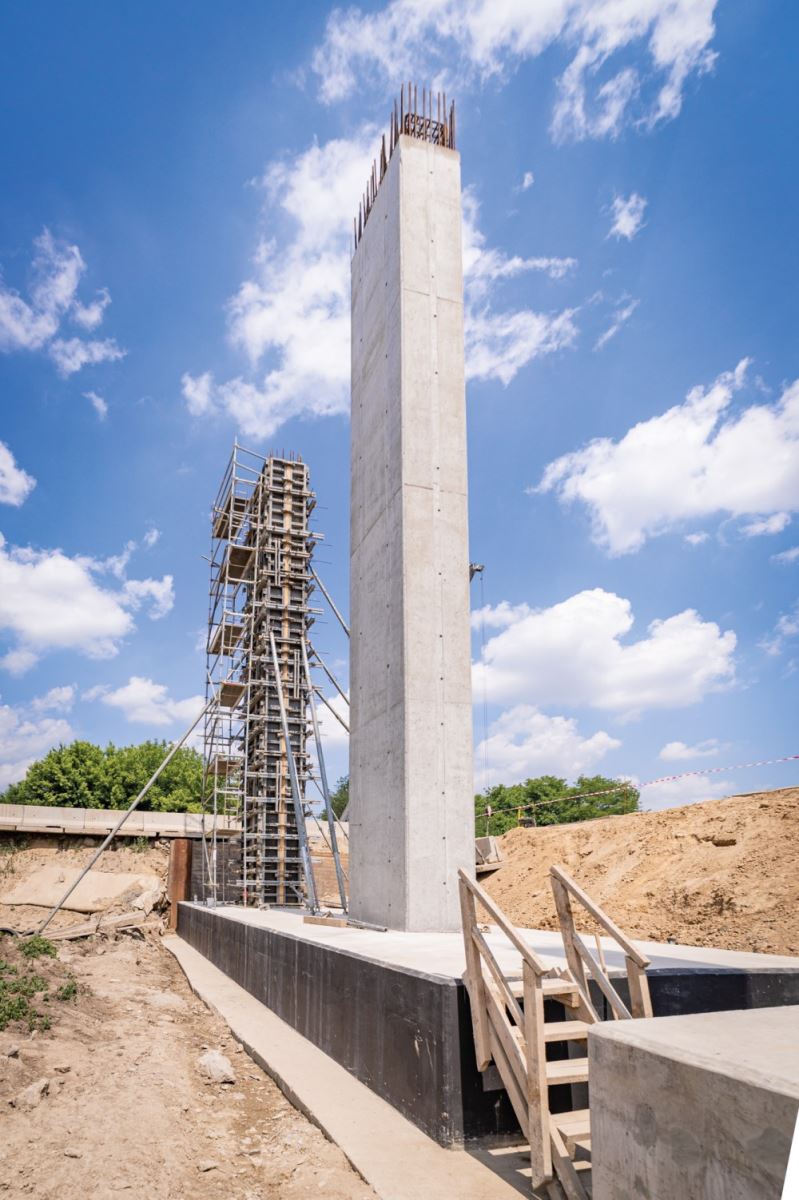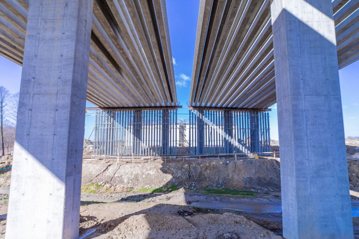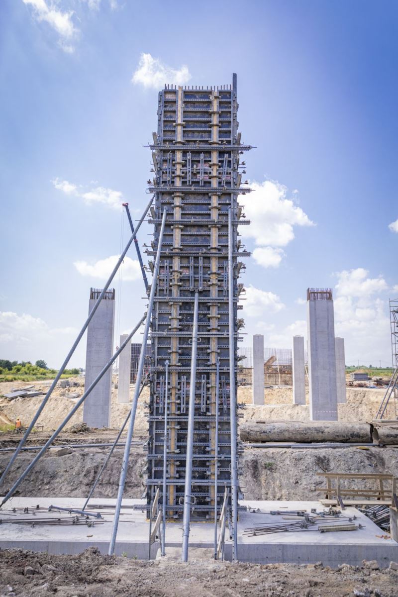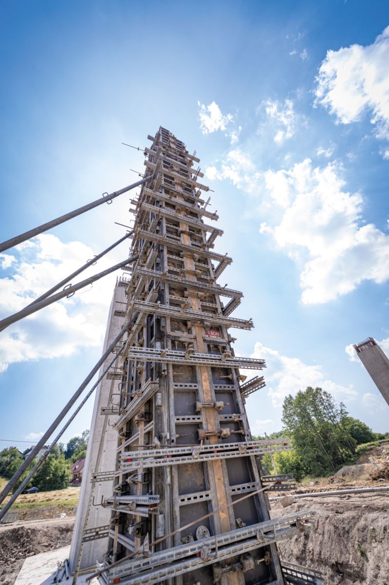 Kolejnym wyzwaniem postawionym przed dostawcą deskowań było szalowanie 12-metrowych filarów wiaduktu. Betonowanie elementów takich jak słupy czy filary zawsze generuje dodatkowe trudności wynikające z tego, że przy stosunkowo niewielkiej objętości generowane jest bardzo wysokie parcie betonu. Konieczność zachowania wysokiej estetyki powierzchni betonowej, a co za tym idzie brak możliwości podzielenia betonowania filarów na etapy nie pomagały w rozwiązaniu problemu. Kolejny raz NOEtop stanął na wysokości zadania. Szeroka gama dostępnych rozmiarów płyt oraz mnogość rozwiązań dodatkowych zwiększających, już i tak znaczne, możliwości systemu sprawiły, że nawet zróżnicowane przekroje oraz różna wysokość całkowita filarów nie stanęły na przeszkodzie by osiągnąć w pełni satysfakcjonujący efekt.