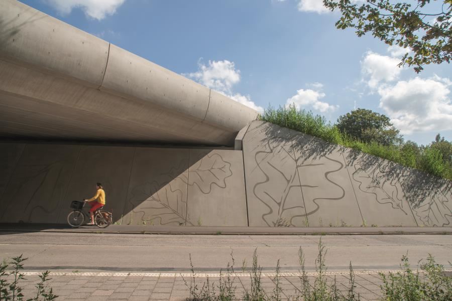 Pięknym przykładem zastosowania takich matryc jest wybudowany pomiędzy Utrechtem i Hilversum w Holandii wiadukt ekologiczny Zwaluwenberg. Ściany przyczółków zdobi tam relief przedstawiający stylizowane liście dębu i żołędzie. Motywy te ujmują swoim prostym, jasnym wzorem linii, których grubość zmienia się i odnosi się wrażenie, jakby były one narysowane ołówkiem do kaligrafii. Stworzona do tego celu odpowiednia struktura NOEliner została na odwrocie zaopatrzona w samoprzylepną folię. Następnie przeprowadzono cięcie żądanych motywów na sterowanych numerycznie ploterach. Dane wektorowe potrzebne do tego celu dostarczyło biuro planistyczne architektów Bosch Slabbers w Hadze. W sumie stworzono 29 różnych motywów. Można je było pozycjonować przy pomocy folii samoprzylepnej jako naklejki na płytach szalunkowych.
