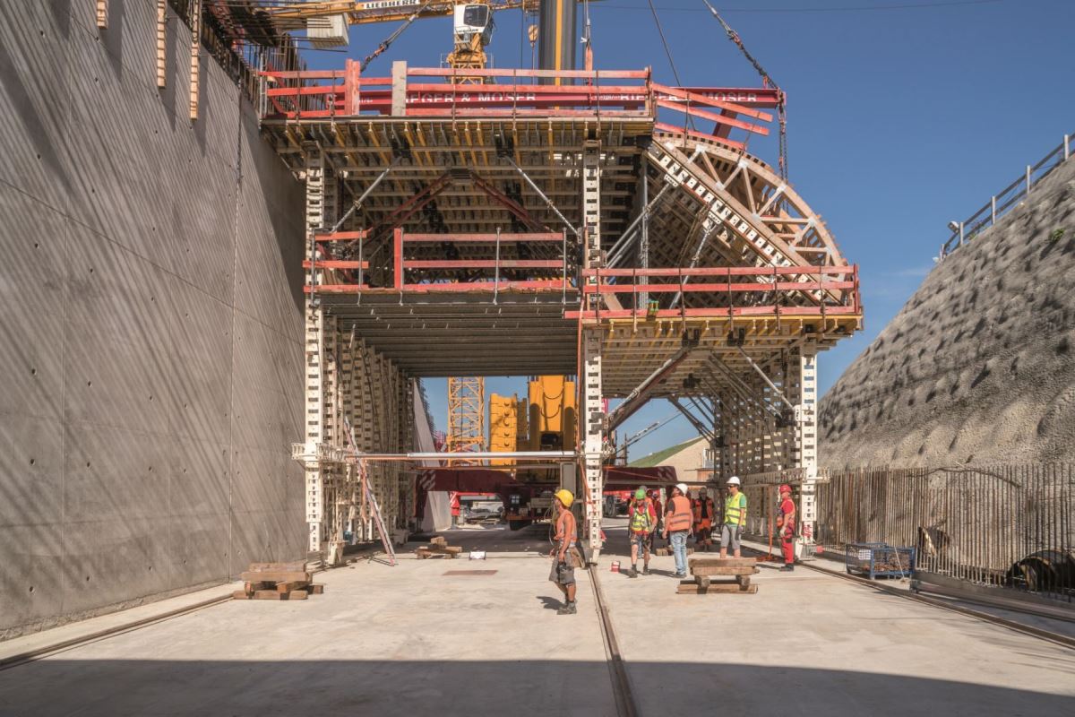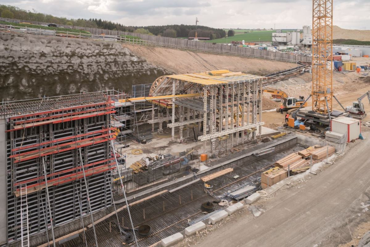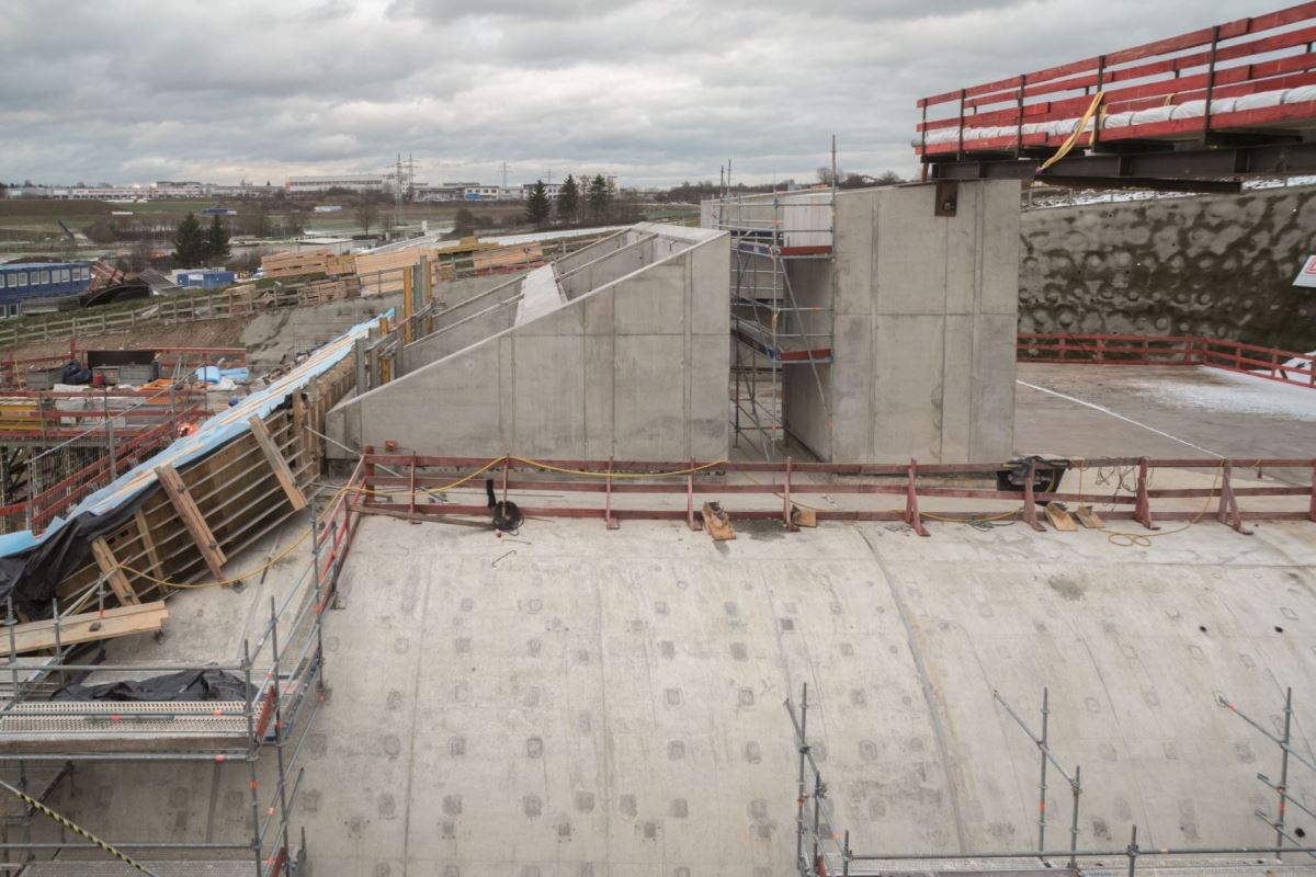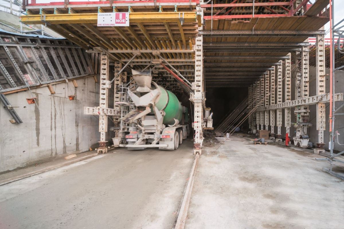 W portalu o długości około 50 m zastosowano wózek szalunkowy NOEtec. Po betonowaniu pierwszej nawy wózek szalunku został przeniesiony do drugiej. Wdrożenie odbyło się w zaledwie 15 minut i zostało z góry zaplanowane przez istne arcydzieło logistyczne. Spowodowało to znaczną oszczędność czasu i kosztów. Do ścian bocznych zastosowano szalunek wielkopowierzchniowy NOEtop, a do poprzeczek szalunek ścienny NOEalu L.Klient: