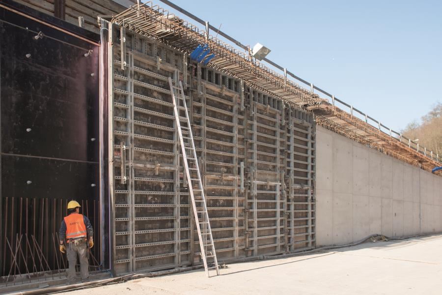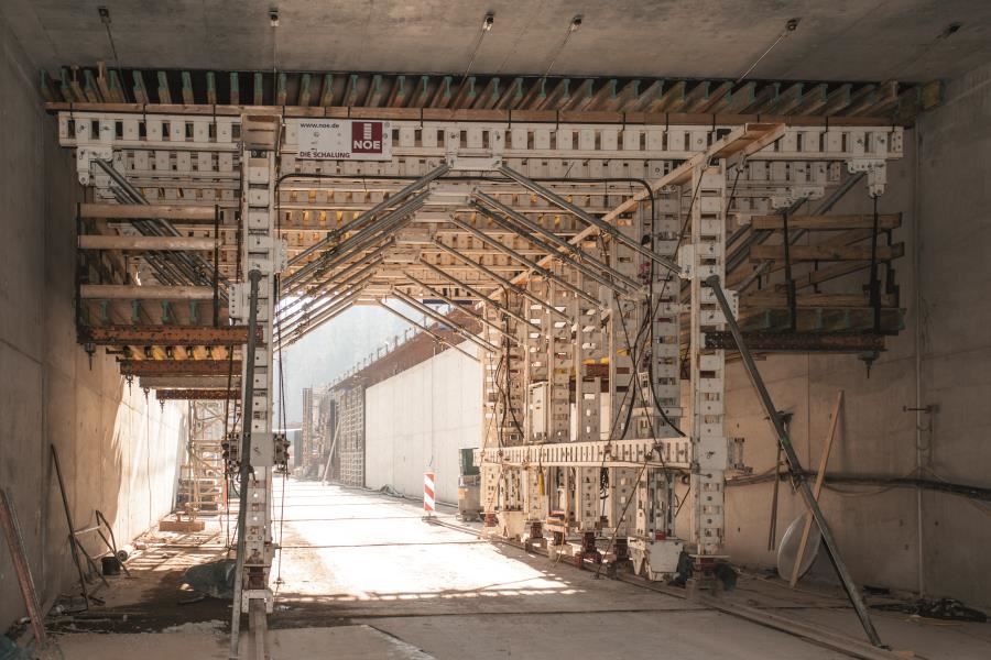 Oba portale tunelu powstały metodą odkrywkową. Ściany tunelu zostały wybetonowane przy zastosowaniu przez Ed. Züblin AG, Stuttgart systemu szalunkowego NOEtop. Aby dosięgnąć do dachu, budowniczy wykorzystali wózek szalunkowy, który technicy NOE złożyli z elementów systemu NOEtec i dopasowali do tego zadania. Ma on ok. 10 m długości, 9,6 m szerokości i 6 m wysokości. Na dźwigarach NOEtec drewniane wsporniki NOE H 20 były użyte jako wzmocnienie dla płyt NOEform. Tym samym można było na raz wybetonować ok. 100 m2 powierzchni dachu. Po tym, jak beton stwardniał, wózek szalunkowy został obniżony o ok. 20 cm i puszczony na następny odcinek. Dla wzmocnienia zastosowano wsporniki NOE LS 200.