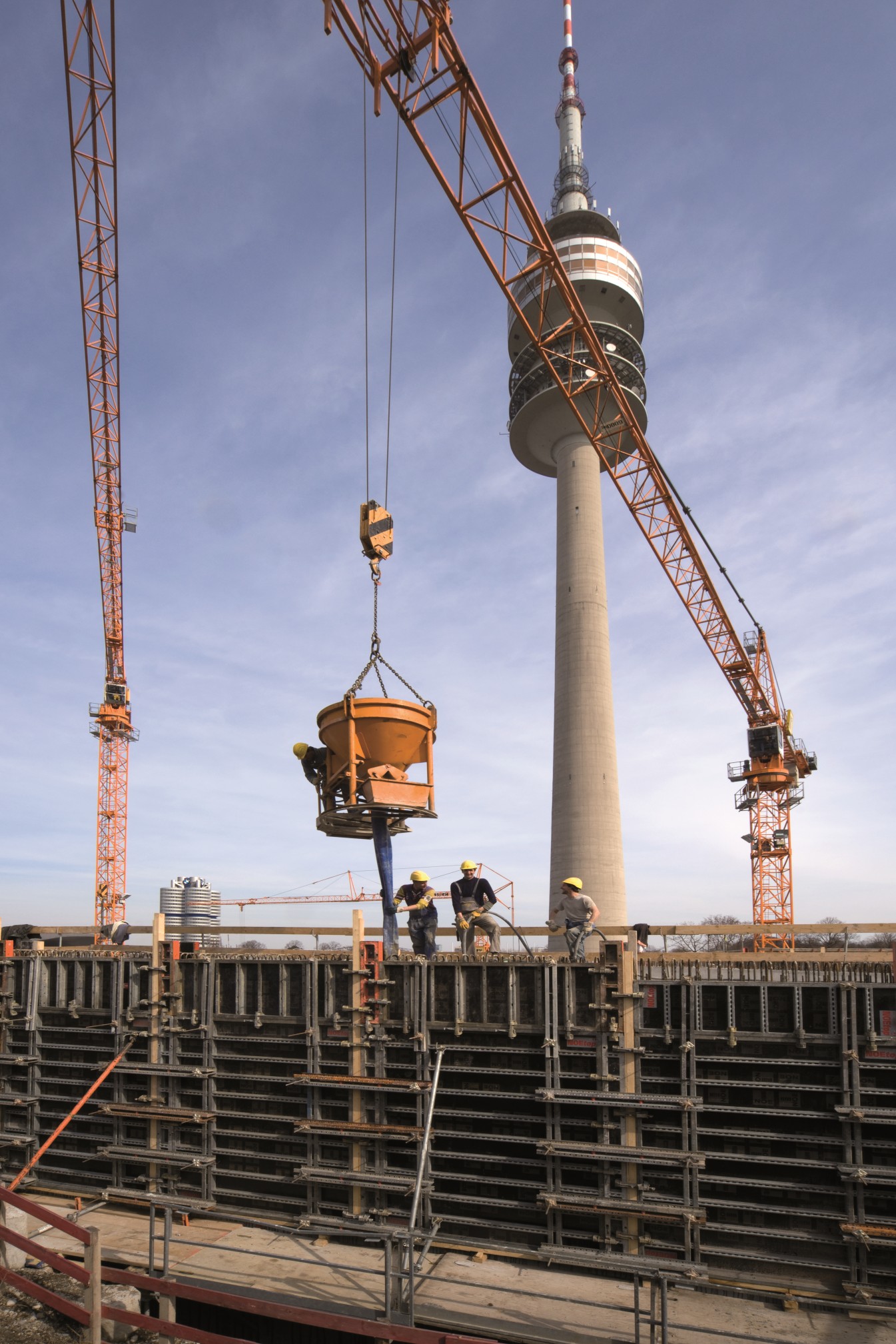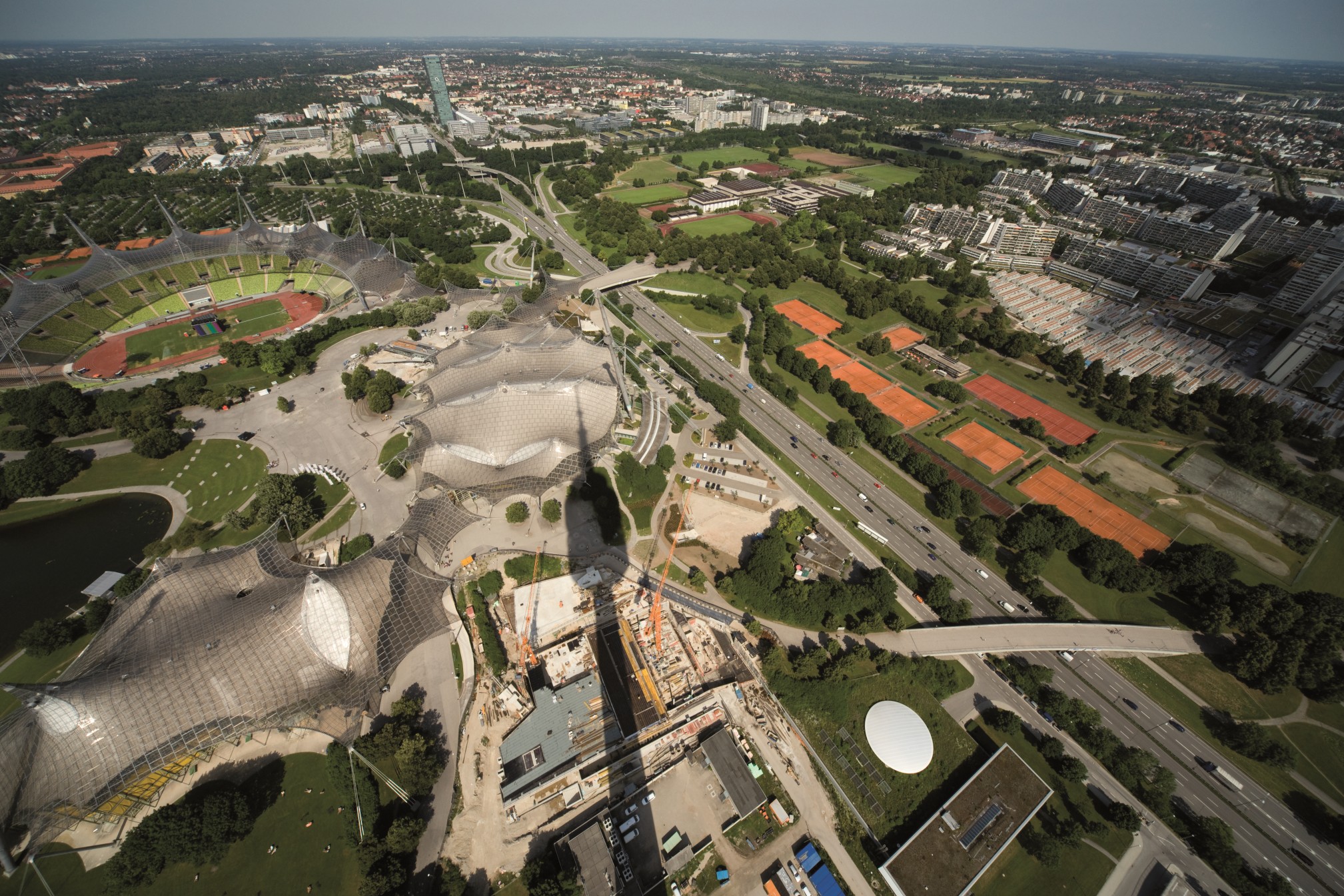 Budowa Parku Olimpijskiego w Monachium została zrealizowana przed 38 laty. Mianem "tworzywa marzeń" określano wówczas: szkło akrylowe do tzw. "dachu namiotowego". To ówczesne marzenie architektoniczne zrealizowane na potrzeby niezwykle radosnego wydarzenia sportowego do dziś cieszy się sympatią ze względu na wyjątkowy krajobraz architektoniczny, jest również uznawane za najważniejszy teren rekreacyjny w Monachium. Jednakże, ten chroniony obiekt starzeje się. Dlatego, na jego terenie prowadzone są aktualnie prace z zakresu renowacji i modernizacji, których koszt wynosi 65 mln euro, kompleks ten powiększy się również o nowe, podziemne pomieszczenie widowiskowe wykonane z betonu elewacyjnego. System sprężeń: NOEtop ze zintegrowanym pasem montażowym. Dzięki temu dopracowanemu systemowi sprężeń możliwe było zachowanie odpowiedniej precyzji przy realizacji zaplanowanego przez architektów efektu zakotwiczenia.