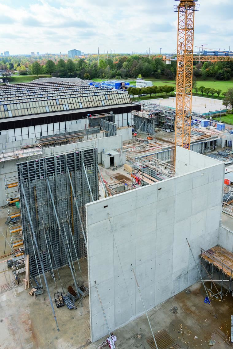 Ogłoszono konkurs a wygrali go architekci z Austrii- Dietrich Untertrifaller oraz Balliana Schubert. Ich projekt przewidywał gigantyczny nowy budynek z sześcioma wewnętrznymi patio. Miał być zbudowany głównie z drewna i szkła oraz gdzieniegdzie z betonu licowego. Drugi etap budowy ukończono z końcem 2018 roku. Firma Grossmann Bau z Rosenheim bardzo się przyczyniła do tego sukcesu. Zleceniobiorca przeprowadził wszystkie prace inżynierii lądowej oraz budowlanej, to jest roboty ziemne, doprowadził kanalizację, zbudował system odwadniający oraz postawił budynki. Oznaczało to, że średnio 75 do 80 a w godzinach szczytu nawet 100 pracowników pracowało jednocześnie na budowie. Firma od wielu lat korzysta z systemu szalunków NOE-Schaltechnik przy pracach z betonem. Tak też się i stało w przypadku prac budowlanych w Parku Olimpijskim. Najważniejszym systemem NOE-Schaltechnik na tej budowie były ścienne szalunki NOEtop. Jedną z wielu zalet tego systemu jest jego wszechstronność. Zintegrowane pasy mocujące systemu NOEtop pozwalają na stosowanie go jako szalunków ramowych lub zamiast szalunków dźwigarkowych. Kontrahent używając tego systemu ma możliwość wyboru pozycji ściągów. Producent produkuje ten system w różnych rozmiarach. Jednym z nich jest wersja XXL, która pozwala na wylanie bez łączeń powierzchni ponad 14 m2. To tej wersji głównie używano na placu budowy w Monachium przy składaniu elementów szalunków o wysokości 2,65 m oraz 3,31 m.
