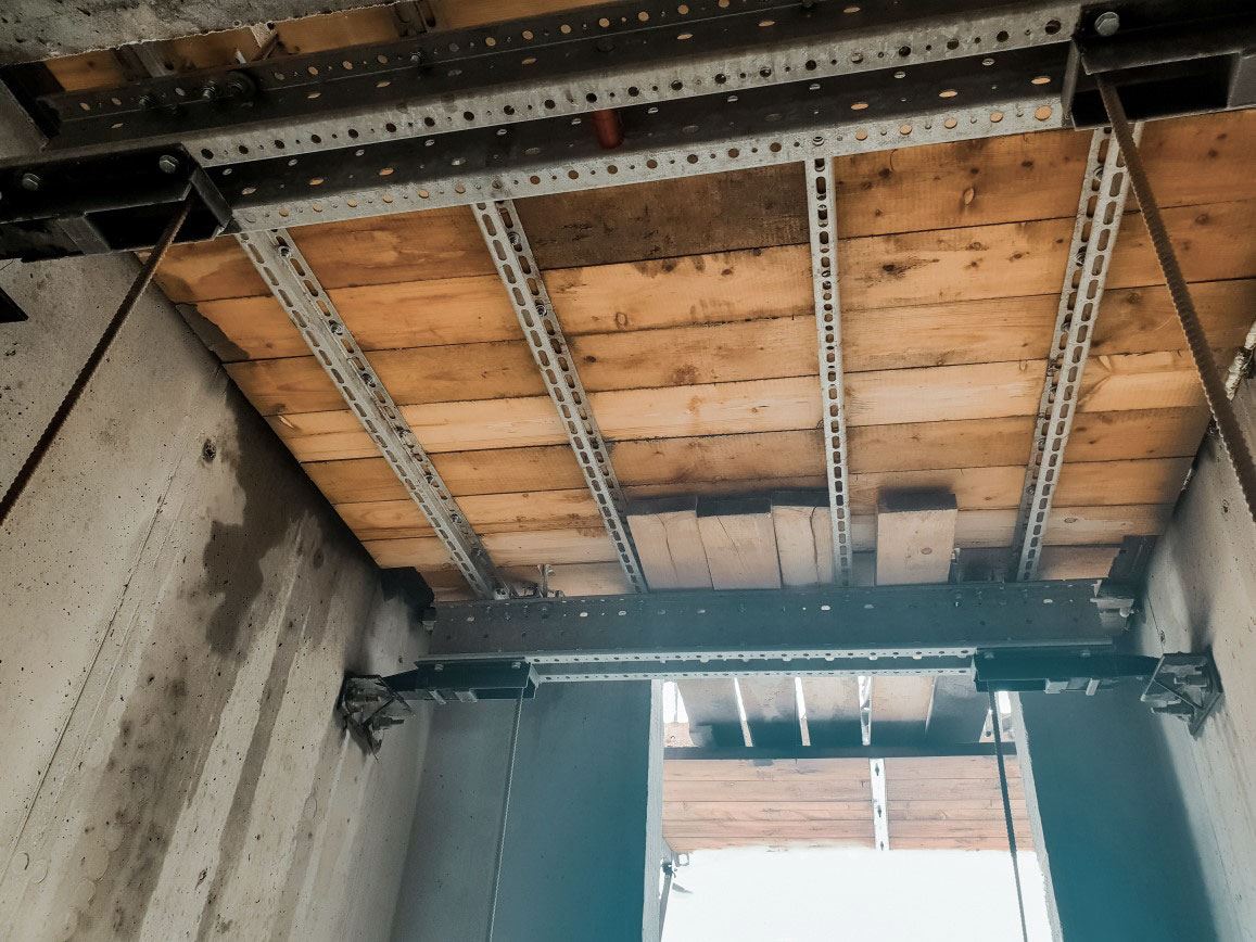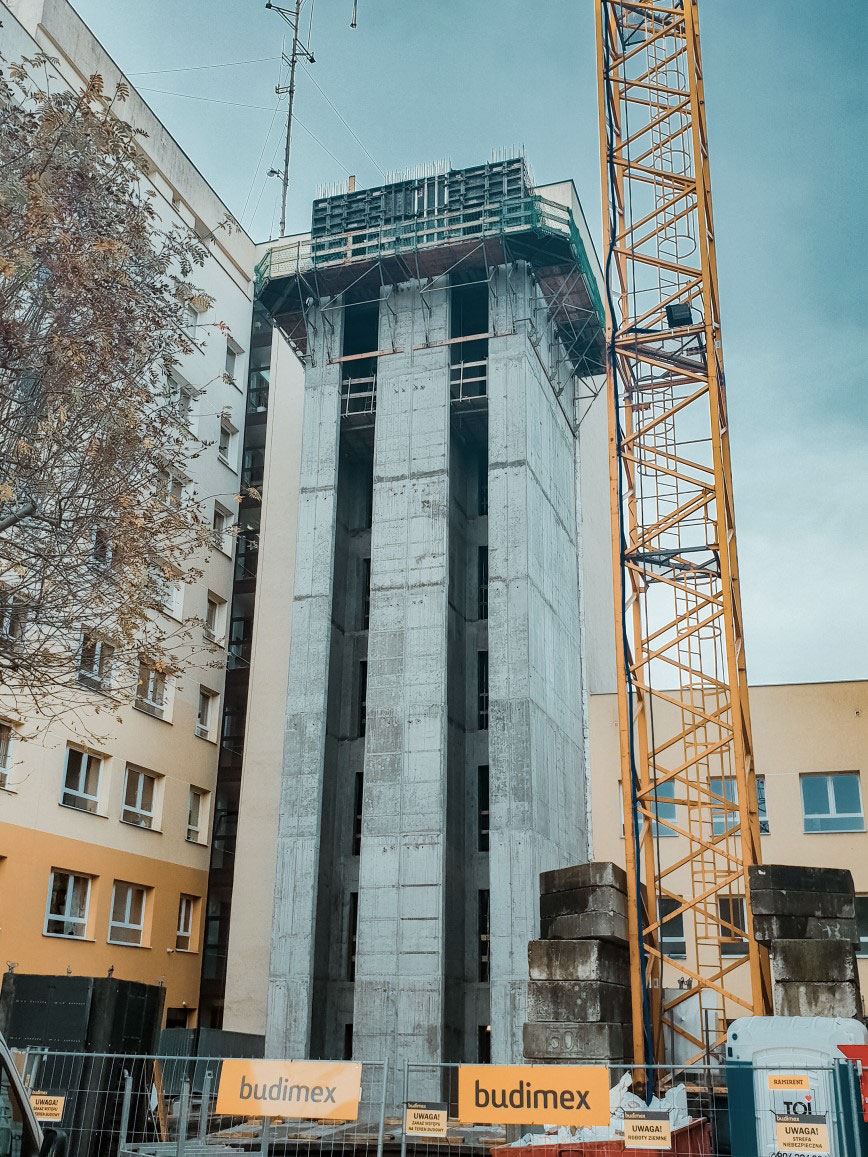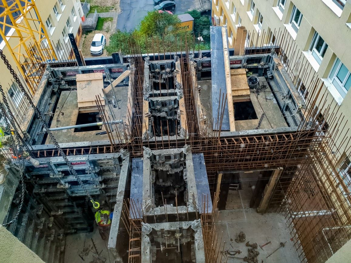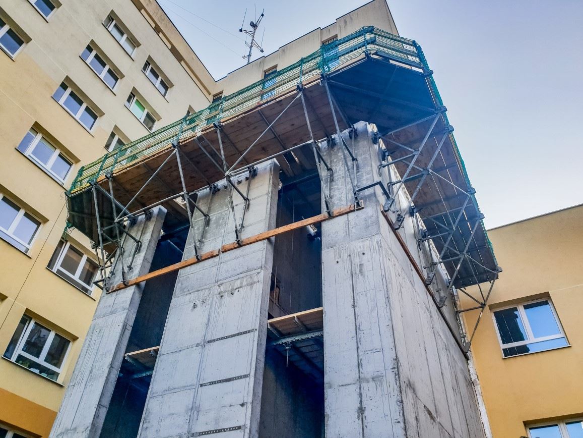 Bardzo ciekawym technologicznie zagadnieniem było wykonanie żelbetowego szachtu windowego przy istniejącym 10-cio kondygnacyjnym budynku. Dla wykonawcy priorytetem było bezpieczeństwo, następnie szybkość i łatwość stosowania. Zdecydowano się na zapadkowy system do szachtów windowych od firmy NOE. Polega on na wykonaniu stelaża ze stalowych profili dopasowanego do gabarytów danego szachtu, który uzbrojony został w specjalne zaczepy/zapadki blokujące się w specjalnie pozostawionych w ścianie wewnętrznej szachtu gniazdach lub na zamontowanych na ścianie kątownikach. Proces blokowania odbywa się automatycznie podczas podnoszenia całego podestu przez dźwig do kolejnego etapu betonowania. Do głównego podestu z zapadkami podwieszany jest drugi podest pod spodem, zapewniający bezpieczny dostęp. Dodatkowo cały szacht zabezpieczony został dookoła tradycyjnymi pomostami roboczymi, łącznie z kluczowymi, przy takich konstrukcjach jak szachty, pomostami narożnymi.